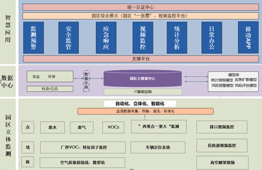 重点围绕安监、环保等部门的协同管理,实现园区管理“一体化”,由“单一闭塞”向“联防联控”转变,并在同一平台框架下建设“监测预警、安全监管、应急响应”几大系统,打造互联互通、协同共治的园区空间治理体系。